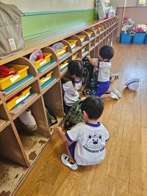 朝の活動(年少満3歳クラス)年少満3歳クラス、朝の活動(日付けのシール貼りと、お支度でタオル等をロッカーにかけています。)です。