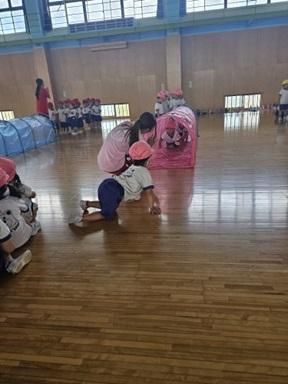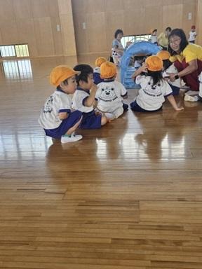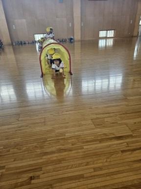 年少さん、体育館に秋の遠足に行きました。トンネルやおいかけっこをしてあそびました。お弁当とおやつは、幼稚園に戻ってから楽しく食べました。お弁当等の準備、ありがとうございました。