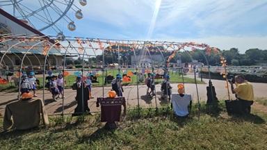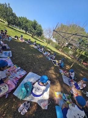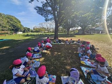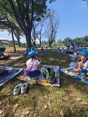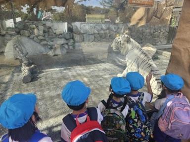 ゾウ、ホワイトタイガー、熊など、たくさんの動物を見学して、こかげでお弁当とおやつを食べて楽しくすごしました。