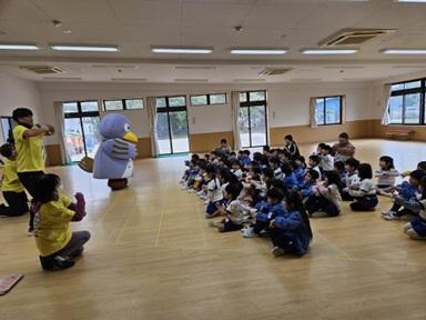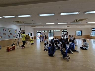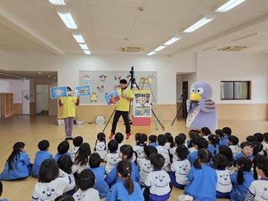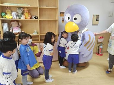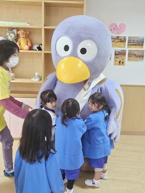 コバトンと、1等賞体操、3種類の物を混ぜたら何になるかな?クイズ、お土産をかけて!先生達によるフリスビーゲーム、写真撮影、コバトンとハグしよう。