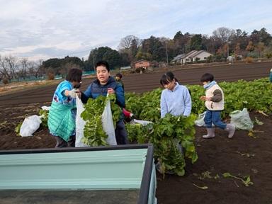 冬休み小学生キッズ、大根ぬきに行きました。前日の雨で少し畑がぬれていましたが、みんな頑張って大根をぬいて、運んでいました。