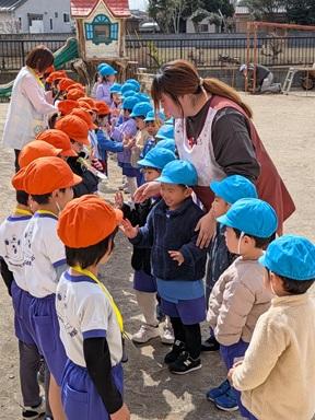 卒園生を送る会がありました。園庭で年長さんにプレゼントを渡したり、年長さんが、各教室をまわり、園内でシールラリーを行いました。